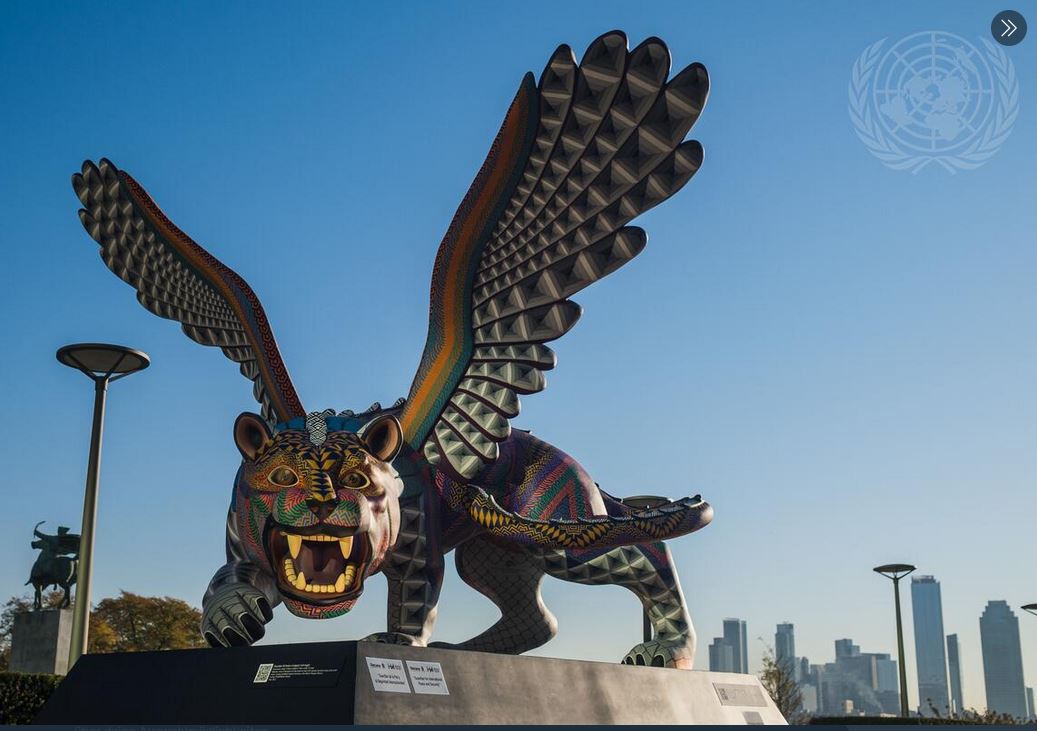 By JÖRG WOLLSCHLAGER | In early November 2021, a statue of a winged jaguar was erected in front of the UN’s visitors‘ plaza, evoking associations among some Christians in the US with the first beast from the Book of Revelation or Apocalypse. According to the UN, it is a guardian of „international peace and security“. So are the Christians wrong and is their interpretation based only on imagination and paranoia?