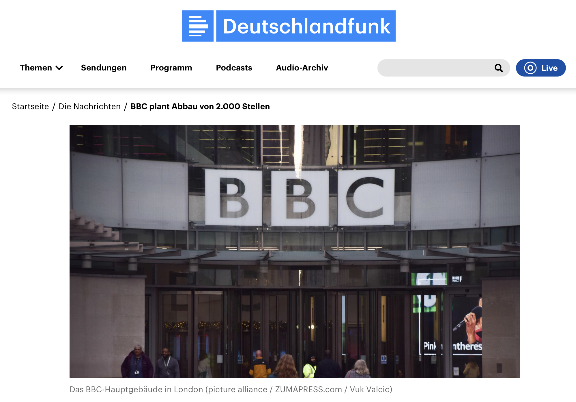 Bei der BBC sollen 2.000 Arbeitsplätze wegfallen. Das berichteten mehrere britische Medien unter Berufung auf Teilnehmer einer Mitarbeiterversammlung der öffentlich-rechtlichen Rundfunkanstalt in Großbritannien.