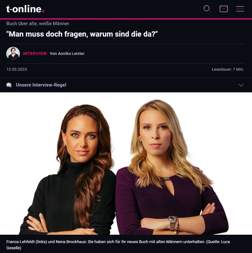 Franca Lehfeldt: Das Grundanliegen der Frauenbewegung unterstützen wir. Aus der Frauenbewegung ist aber Identitätspolitik geworden, die ein Feindbild brauchte – den "alten weißen Mann". Es ist eben leichter, sich gegen etwas zu definieren als eigene Werte zu setzen. Wir wollen mit dem Buch ein Zeichen setzen, dass innere Überzeugungen nichts mit dem Alter oder Geschlecht zu tun haben. Daher haben wir dieses Feindbild für unser Buch umdefiniert und mit "alten weisen Männern" gesprochen: Die sind mindestens 70 Jahre alt, haben Erfahrung, ein festes Wertesystem und bekennen sich zum Leistungsprinzip.