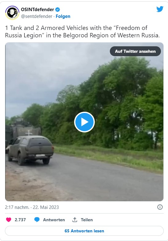 Gleichzeitig berichtete „OSINTdefender“, dass 6–8 gepanzerte Fahrzeuge und Panzer der Legion in die Region Belgorod im Westen Russlands eingedrungen wären, und bestätigte+ ebenfalls, dass die Stadt Kozinka gefallen ist. Die Kampffahrzeuge hätten dann ihren Angriff in Richtung Grajvoron fortgesetzt.